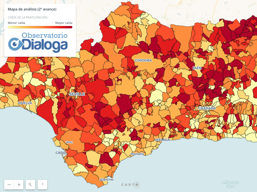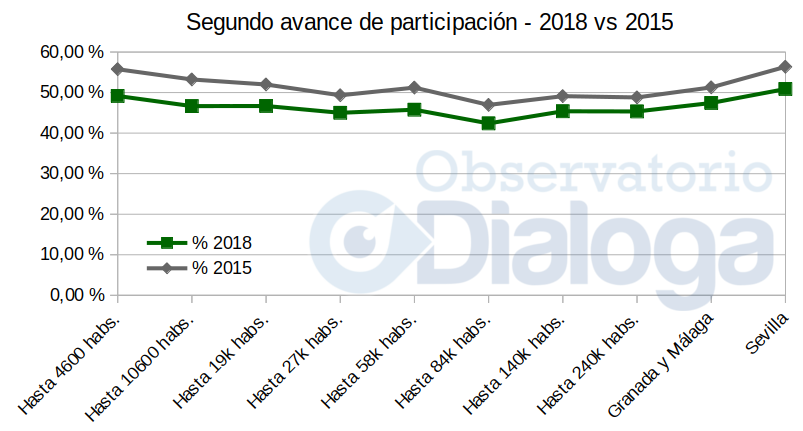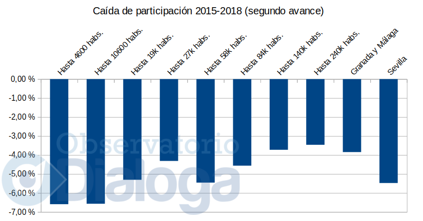 El perfil de participación por tamaño del municipio sigue con la misma dinámica que en el avance de las 14h: mayor caída en Sevilla y en poblaciones de menor tamaño.