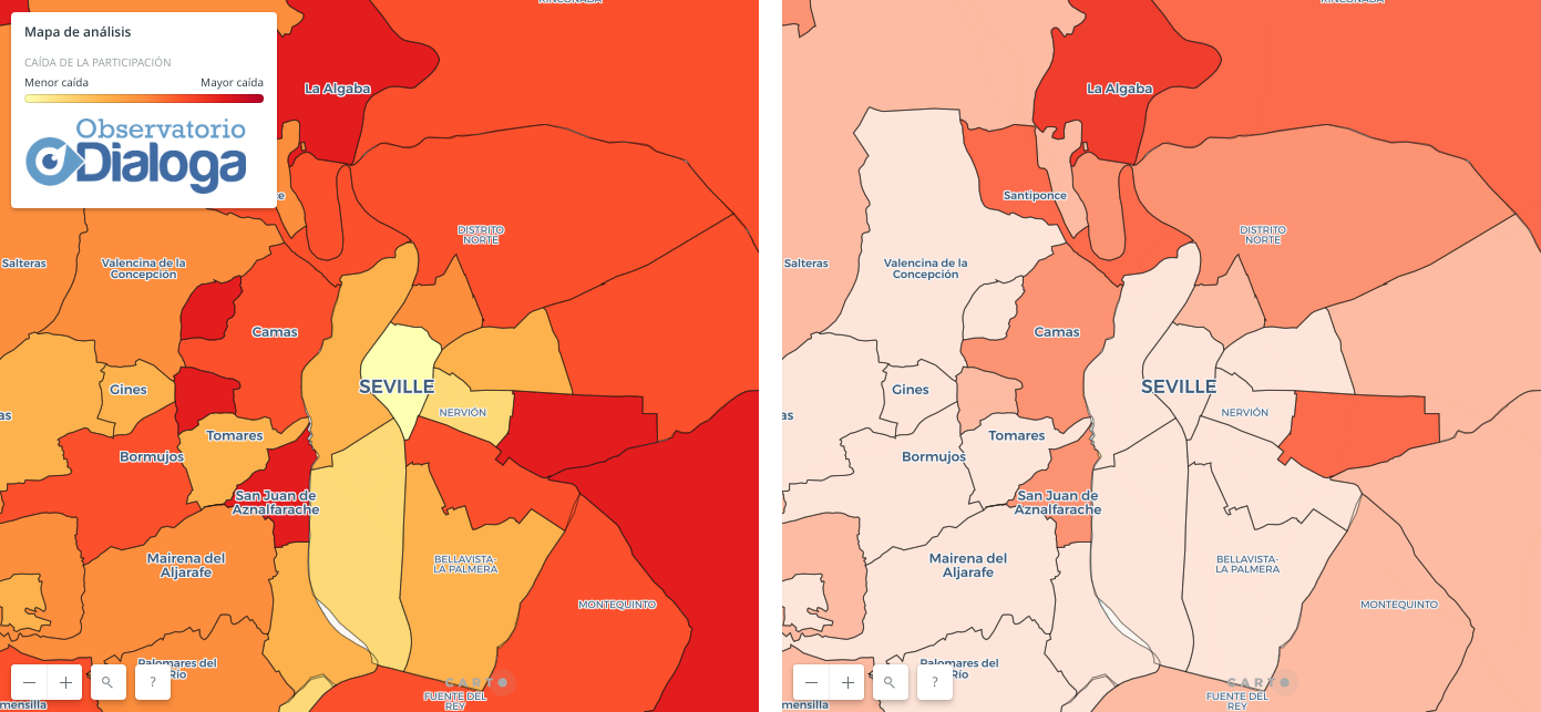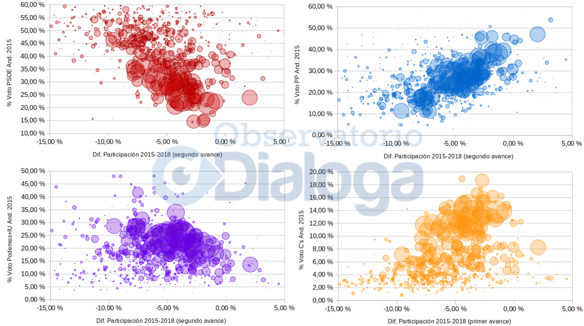 A priori, y comparando los mapas con los datos de participación de las 18.00, en el PSOE-A parece que deben empezar a temer nno tener una ventaja tan amplia como la que se esperaba en las encuestas. De todas formas, es pronto para sacar conclusiones.